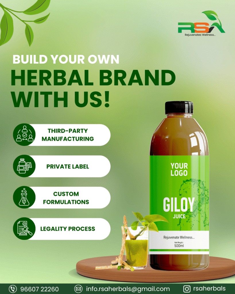RSA Herbals is among the top herbal product manufacturers in Rajasthan, delivering Ayurvedic juices, tablets, and nutraceuticals for both Indian and international markets. Our specialization in Giloy juice manufacturing makes us the preferred choice for startups, entrepreneurs, and established herbal brands.